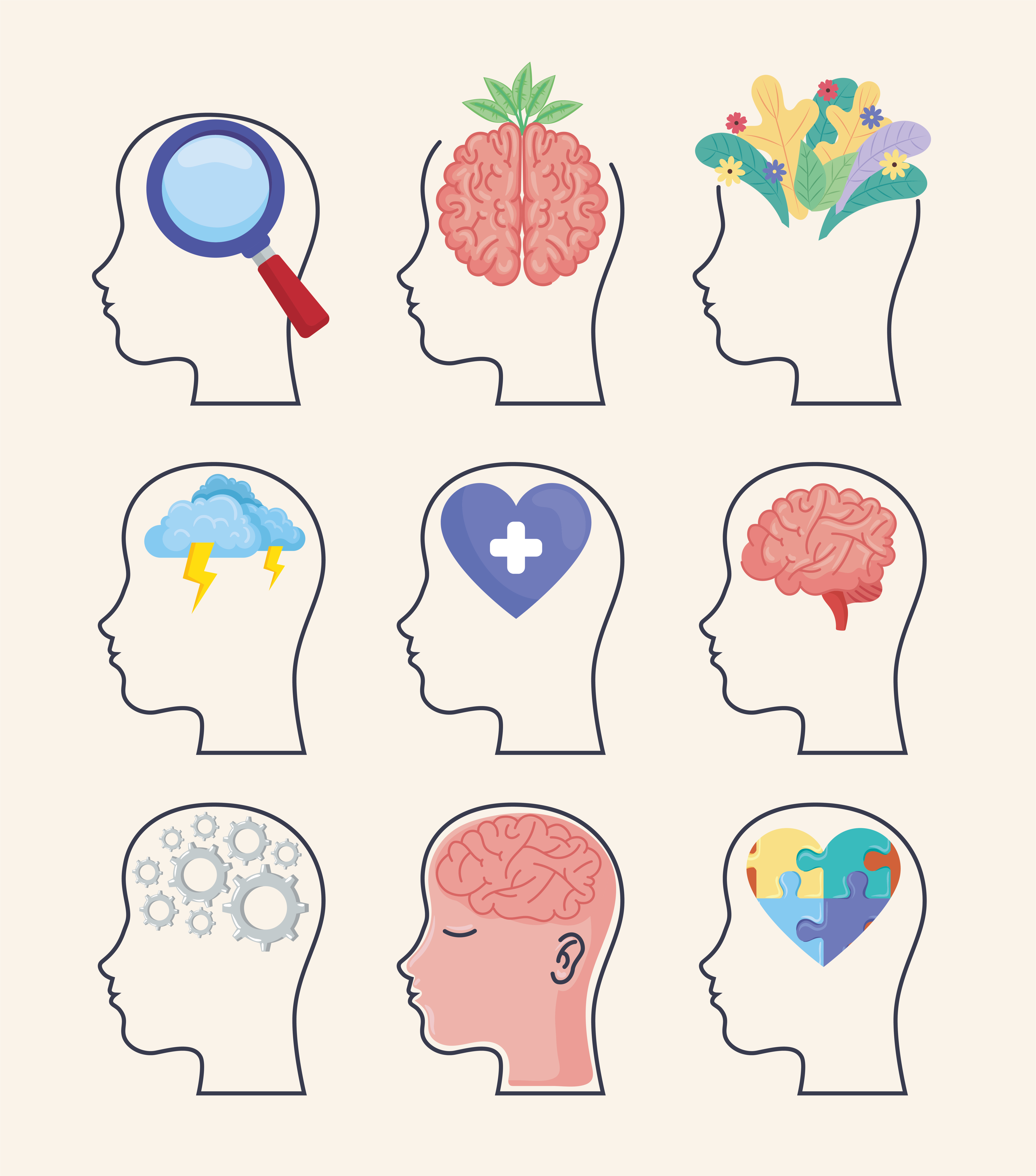 9 heads with different things happening inside